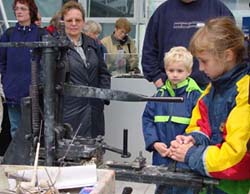 Ein Mädchen an einer Maschine in den Gärten. Sie stellt unter Anleitung aus Ton eine Pfeife her.