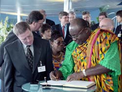 Der Minister Peter W. Pepera trug sich anschließend ins Gästebuch des Deutschen Pavillons ein, bevor er und seine Delegation zum Stand Ghanas im Afrika-Pavillon weitereilten.