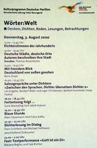 | Falls Sie sich zur Blauen Stunde gerade woanders tummeln: Macht (fast) nichts. Andere interessante Veranstaltungen der "Wörter:Welt" erstrecken sich heute über den ganzen Tag; Schauen Sie einfach irgendwann vorbei. |  Für Adleraugen: Das heutige Tagesprogramm