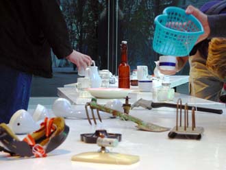Indem Sie an den auf dem Tisch verteilten Gegenständen ziehen, erzeugen Sie Sätze, Worte oder Wortfetzten. Je mehr sich daran beteiligen, desto umfassender wird die Gesamt-Komposition.