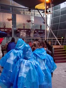 |  Ein gehöriger Regenguss läutete heute die Länderwoche des Saarlandes ein. Blaubemantelte Besucher, wie hier bei der Installation im Nordgarten des Pavillons, beherrschen derzeit das Bild (Foto). Die Installation trägt den Titel "Menschenbilder": Zwei Schauspieler führen die Besucher alle 15 Minuten auf einer imaginären Reise durch das kleine südwestliche Bundesland. Gratispostkarten, die dort in mehreren Displays ausgestellt sind, sollen für eine rasche Verbreitung dieser Aktion sorgen. © Foto: C. Radke |
