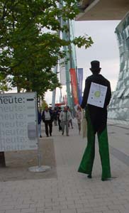 ...stellt heute im August-Everding-Saal das Projekt Grünes Oval vor, eine virtuelle Reise durch Naturräume und Schutzprojekte Deutschlands. Sie können an einem Quiz teilnehmen, für das der hochgewachsene Mann mit Zylinder (Foto) kräftig die Werbetrommel rührt. Versuchen Sie am besten gar nicht, ihm auszuweichen, sondern machen Sie mit: Tolle Gewinne warten! | |