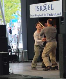 ...so wie heute morgen beim Nationentag Israels. Israelische Künstler kreierten einen erstaunlichen Rhythmusteppich nur mit Händeklatschen, Body-Percussion und ihren Füßen. Mit Trommelstöcken lieferten sie sich musikalische "Fecht-Duelle" (Foto links)... | |